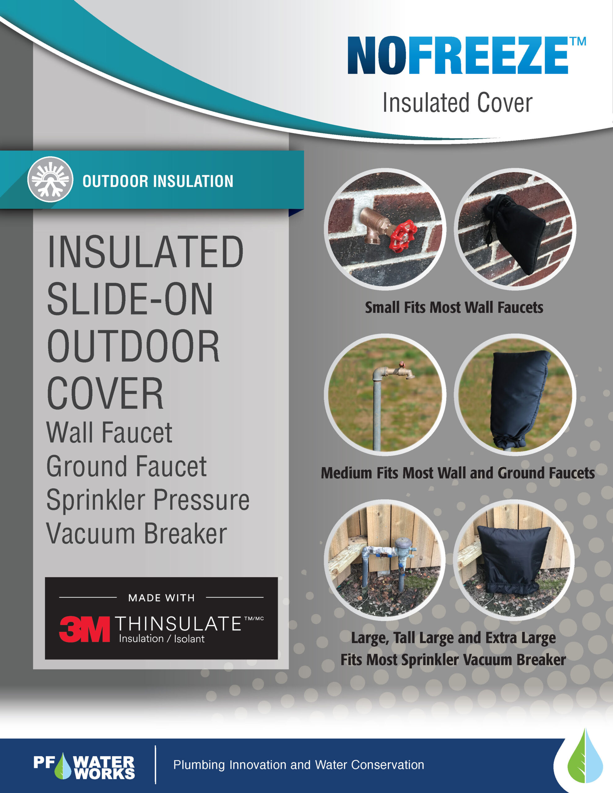 NoFreeze outdoor faucet insulated cover protects outdoor faucets from freezing by providing industrial grade insulation with water proof durable fabric. Preventing water freeze ups averts catastrophic failures and avoids expensive repairs. Installation is very simple – just slip on the cover onto the faucet and secure with lock tie string. Different sizes available for ground/wall faucet and sprinkler vacuum breakers – small (6″x6″), medium (8″x20″), large (18″x18″), extra large (24″x24″) and tall extra large (18″x24″)